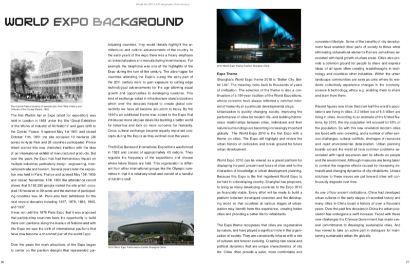 This is a must have for those who could not attend the World Expo in Shanghai China, and for those who could not visit all of the pavilions. With over 2000 photographs this version meticulously captures all of the 214 participating countries. It also includes a time-line of World Expositions and background on the 2010 Expo theme. A great way to explore and remember the largest World Expo ever!